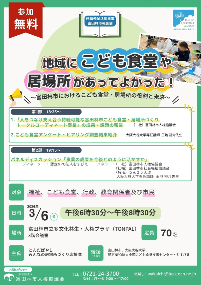 3月6日金曜日の18:30~20:30まで「地域に子ども食堂や居場所があってよかった」~富田林市における子ども食堂・居場所の役割と未来~が富田林市立多文化共生・人権プラザ(TONPAL)の3階会議室で行われます。参加費無料で対象は福祉、子ども食堂、行政、教育関係者及び市民で定員は70名です。主催はとんだばやしみんなの居場所づくり応援隊で後援を予定しているのが、富田林市、大阪大谷大学、認定NPO法人全国子ども食堂支援センター・むすびえです。