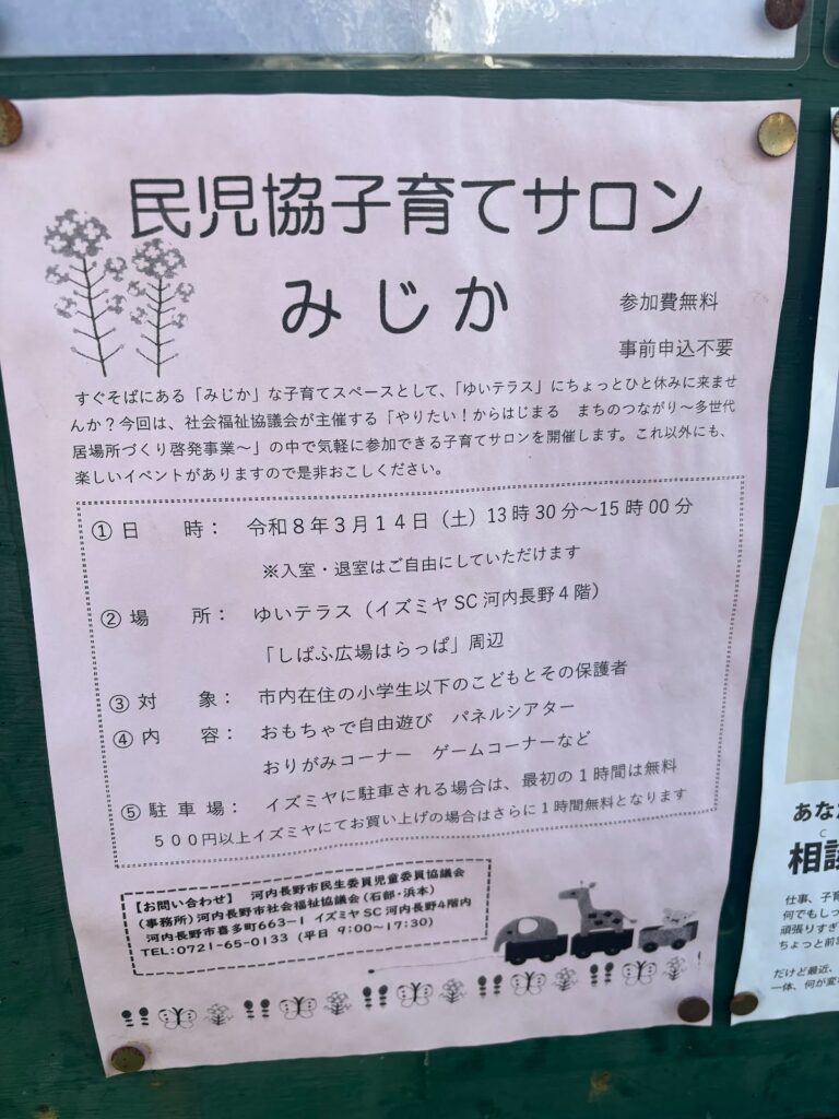 3月14日にイズミヤゆいてらすで民児協子育てサロンみじかを無料開催します。すぐそばにある「みじか」な子育てスペースとして社会福祉協議会が主催する「やりたい!からはじまるまちのつながりから~多世代居場所づくり啓発事業~」の中で気軽に参加できる子育てサロンを開催します。時間は13:30~15:00となっていますが、入室と退室は自由です。場所はイズミヤSC河内長野4階のゆいテラス「しばふ広場はらっぱ」周辺です。