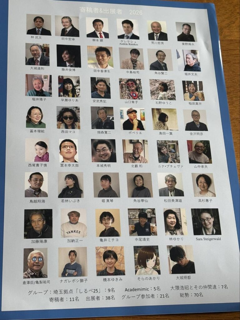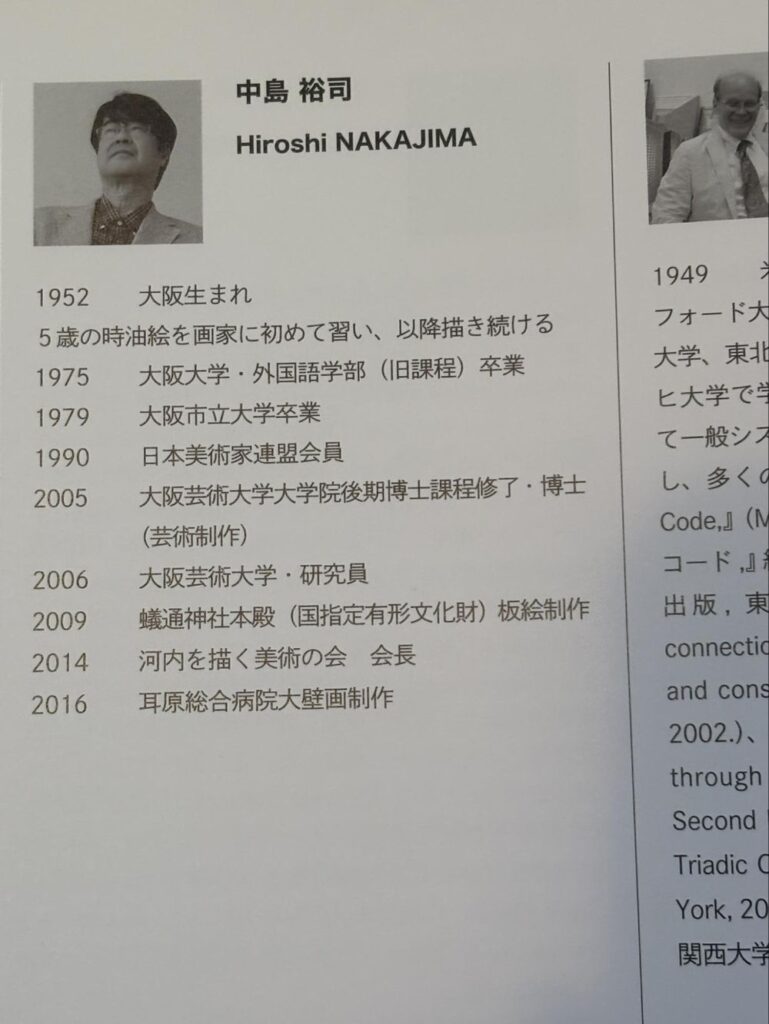 参加アーティストは上の通りです。47名の写真が出ています。様々なジャンルの方が参加しており、中島さんをはじめ、大学の研究者の人や中島さんの学校の教え子だった人、12月の「わたしたちの宇宙と大地展」に参加アーティストなどの作品が見られます。また富田林寺内町の、今昔の玉手箱の亀井ミチヨさんも参加されます。