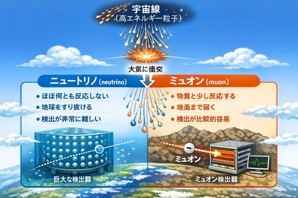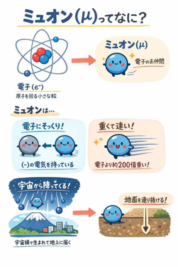 とにかく小さなものですが、説明によると電子より200倍ほど重いそうです。宇宙から飛んできた宇宙線が地球の大気に触れるときに発生しますが、寿命が2.2マイクロ秒なので人間からすればほんの一瞬です。