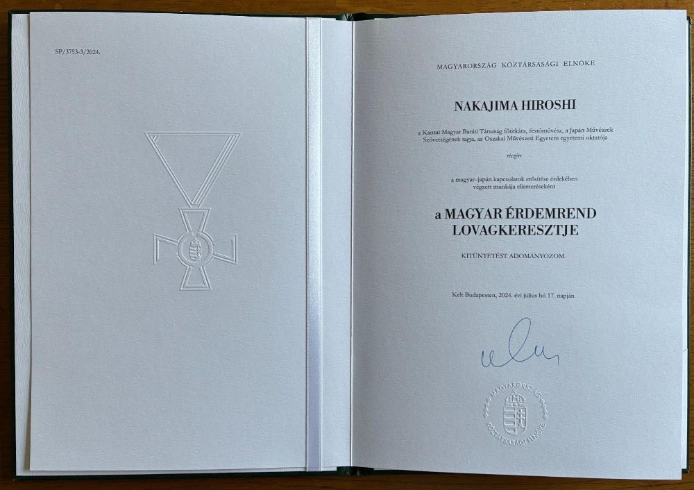 そして、本来ならハンガリー本国に行ってハンガリーの元首シュヨク・タマーシュ(Sulyok Tamás)大統領から直接手渡されるそうですが、今回は東京の大使館でハンガリー臨時代理大使コバーチ・エメシェ氏より受けたとのこと。得た勲章はハンガリーの最高ランクで5番目に位置するもので、15年の交流と10年のミュオグラフィアートの貢献がハンガリー政府に認められたわけです。さらに以下の功績が認められました。国際美術研究所(外部リンク)より引用します。
