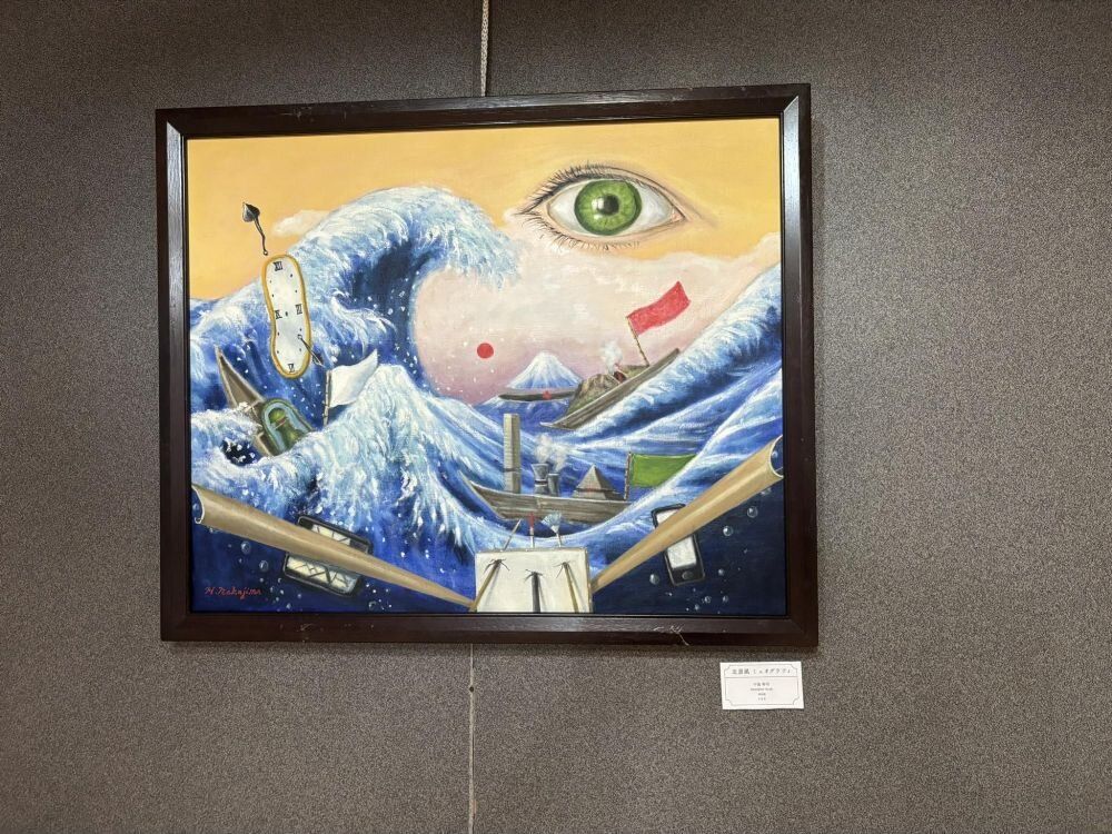 その中の一枚がこちらです。芸術博士で大阪芸術大学の非常勤講師でもある中島裕司(Nakajima Hiroshi)さんの作品「北斎風ミュオグラフィ」です。河南町に自宅があるのですが、河内長野市内にアトリエがあり、そこで描かれたものです。