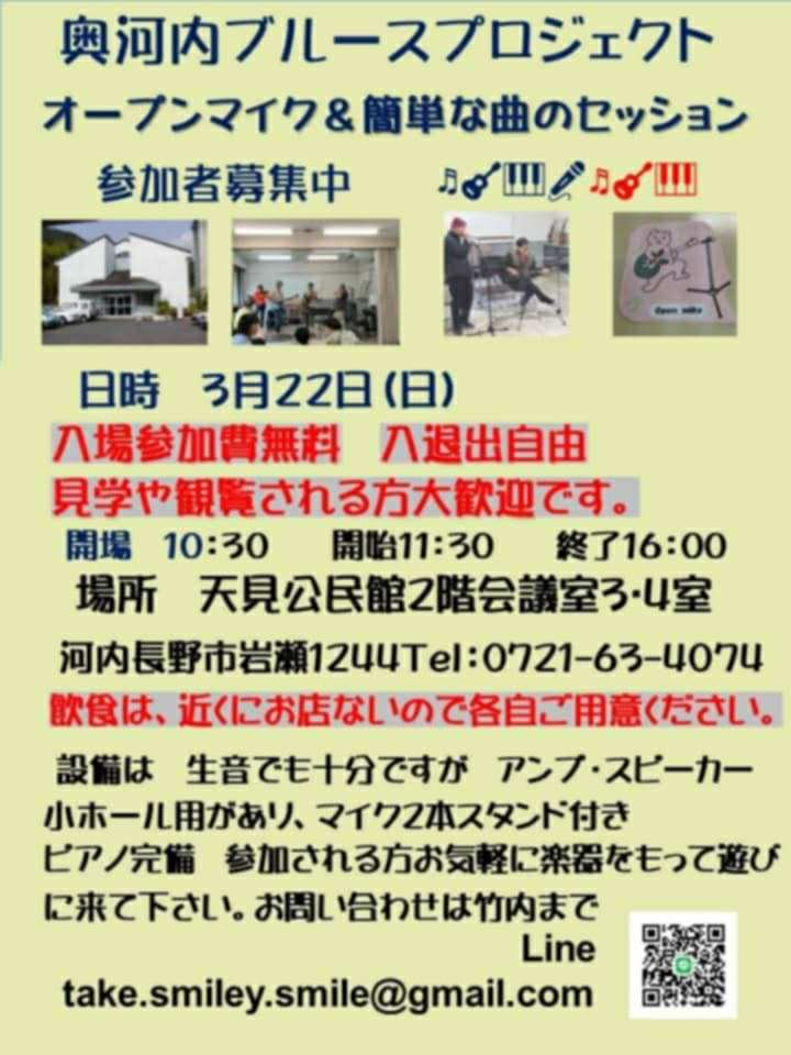 奥河内ブルースプロジェクトによると3月22日にオープンマイク&簡単な曲のセッションを行うので、参加者を募集しています。参加費は無料で自由に入退室できます。また演奏をしなくても見学や閲覧だけの方も大歓迎です。開場は10:30で開始は11:30、終了は16:00の予定です。