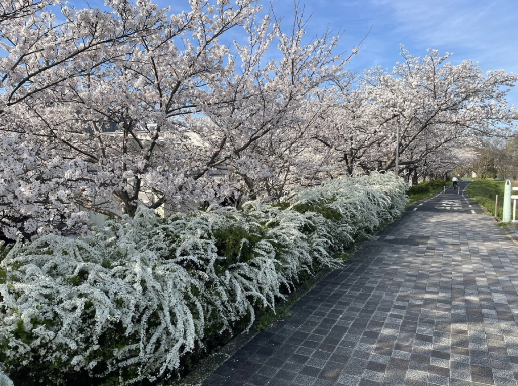 富田林を縦断する石川の河川敷も桜のスポットであることを忘れてはいけません。季節柄、ユキヤナギも咲く時期と重なるので、白とピンクのコントラストが、河川敷の自転車専用道沿いで見られます。