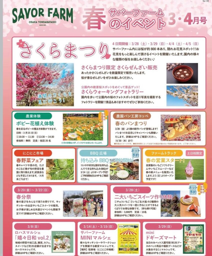 サバーファームでは3月28日、3月29日、4月4日、4月5日にさくらまつりが行われます。また3月20日〜22日は春分債が行われるとのこと。