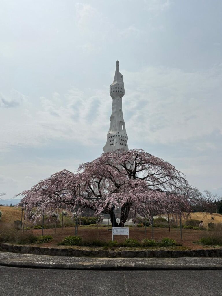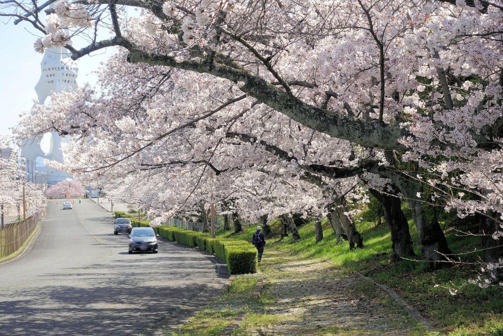 富田林の象徴と言える「PLの塔」こと大平和祈念塔。かつて行われていたPL花火が有名でしたが、桜も忘れてはいけません。特に塔の正面にある大きな枝垂桜は一見の価値があります。「聖なる乙女の祈り」という名前がついています。そして枝垂桜に行く前の通りでも桜の咲く時期には一面の桜並木が美しいです。