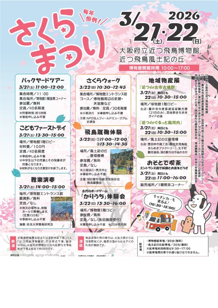 こちらも春に行けていないので桜の画像はないのですが、河南町にある近つ飛鳥風土記の丘は、例年桜まつりが行われます。今年は次の土日、3月21日と22日に行われます。土曜日、日曜日それぞれイベントが行われますので、気になるのは天気だけですね。