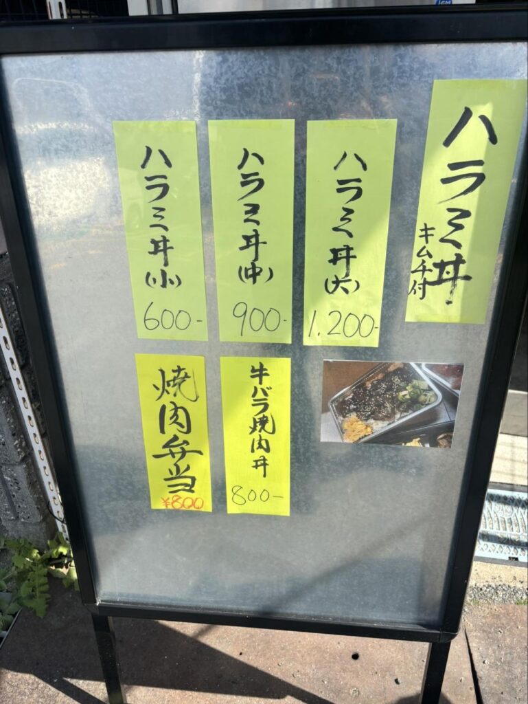 おにぎり小屋と書いていますが、メニューを見るとハラミ丼や焼肉弁当とあり、おにぎりとは違います。不思議に思っていると、ちょうどオーナーさんがいらっしゃったので話を伺いました。