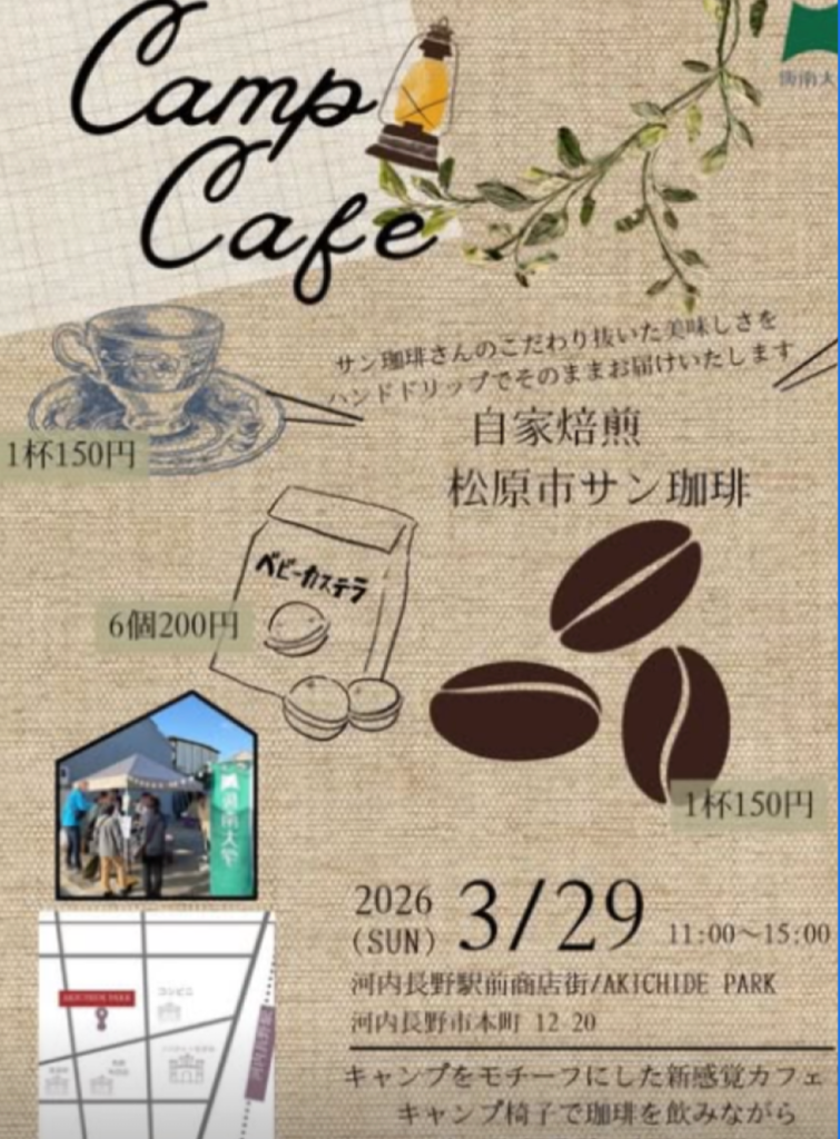 コーヒーは松原市新堂1丁目のコーヒー豆専門サン珈琲さんでのコーヒーで一杯150円、ハンドドリップで提供します。6個200円のベビーカステラも販売します。