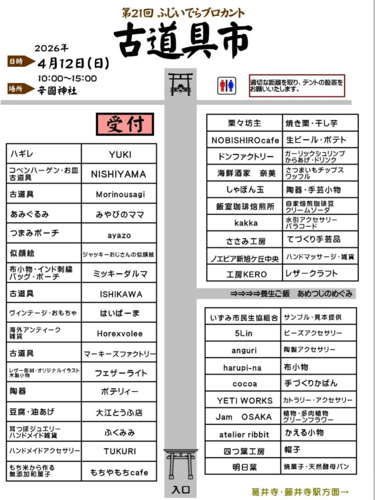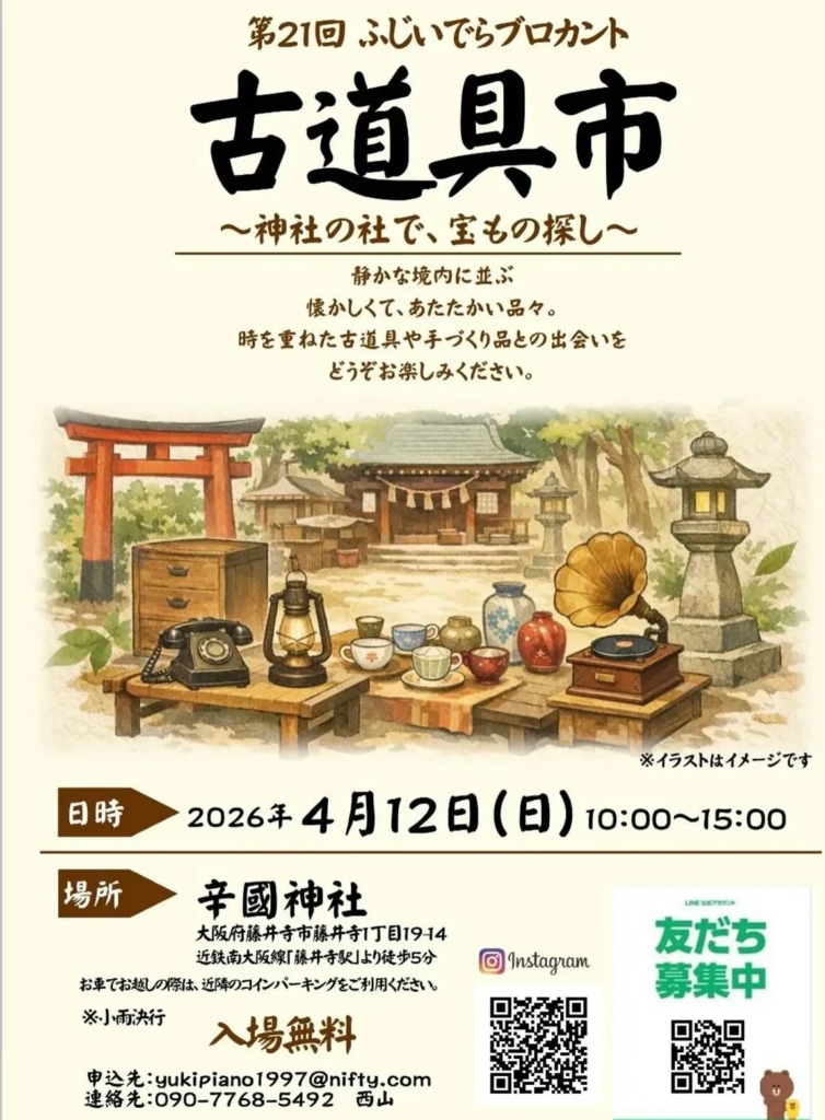 神社の社で宝物探し!第21回ふじいでらブロカント古道具市が辛國神社で行われます。4月12日10:00~15:00まで。入場は無料、小雨決行です。