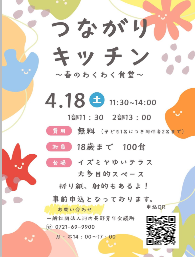 一般社団法人河内長野青年会議所によると、4月18日イズミヤゆいテラスで事前申し込み制の「つながりきっちん」を開催します。申し込みはこちらのフォームから可能で、対象は18歳まで(子ども1名に尽き同伴2名まで)で、無料。定員は100名です。時間:1部11:30~ 2部13:00~となっています。メニューは牛カルビ丼で、アレルギー物質は次の通りです(小麦、大豆、ごま、乳、卵、鶏肉、りんご、牛肉)