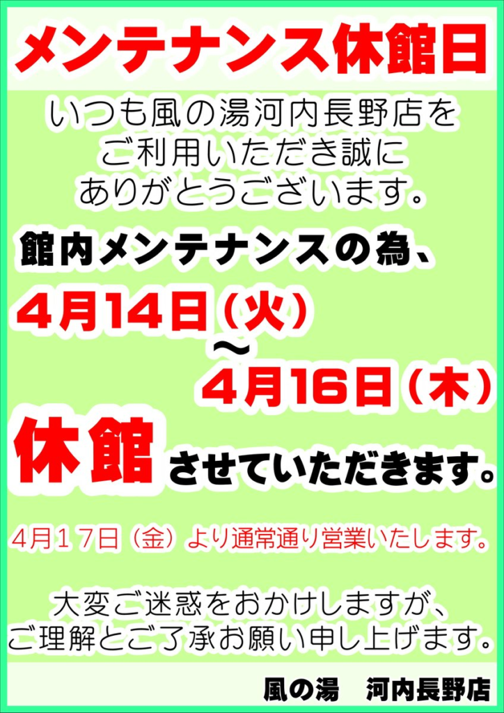 風の湯河内長野店によると4月14日から16日の3日間臨時休館します。17日から通常営業になるとのこと。
