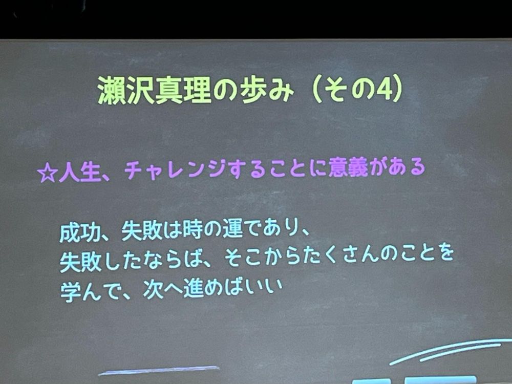 そして、瀬沢さんは中学3年生にこういいます。「人生、チャレンジすることに意義がある」と。時の運で成功や失敗はあるけれど、失敗したとしてそこから学んで次に進めばよいと言います。