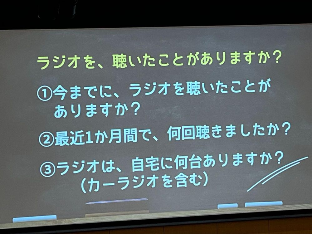 最初に瀬沢さんは、ラジオについて中学3年生に問いかけます。①のラジオを聞いたことの無いという中学3年生はさすがにほとんどいません。ただ②の問いに対しては5回以上は2割程度しかおらず、1度も聞いていないという中学生は5割に上りました。