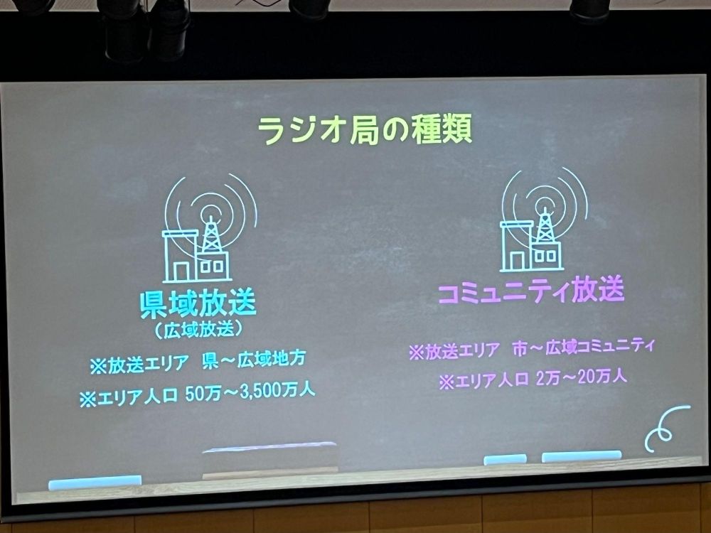 次にラジオ局の種類について、一般的に聞くラジオは左の県域放送ですが、瀬沢さんは右のコミュニティ放送を目指します。最大20万人の耳に届けるのは地域の身近な話題を中心としたもの。