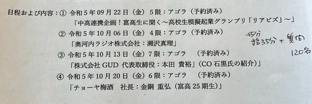 富田林中学3年生の特別授業は、画像のような日程で行われます。そのうちの2番が瀬沢さんです。