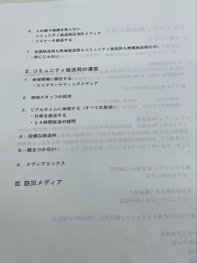 こちらが当日の内容です。コミュニティFM局についておさらいすると、あくまで通常の公共放送ですが、放送対象地域が従来の広域放送や県域放送より狭く、「地域密着」「市民参加」「防災および災害時の放送」が大きな特徴とのこと。