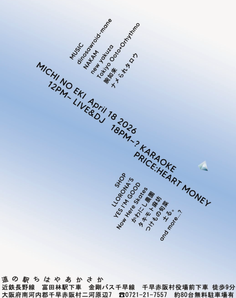 4月18日土曜日に「未知の駅ちはやあかさか」行われます。12月14日に実験音楽(experimental music)と呼びたくなるような不確定性を含む音楽ということで行われたイベントが4月に再び開催が決まりました。当日は12時からライブ&DJ、18時からカラオケタイムです。6組のアーティストによるミュージックタイムと7組以上の出店が予定されています。