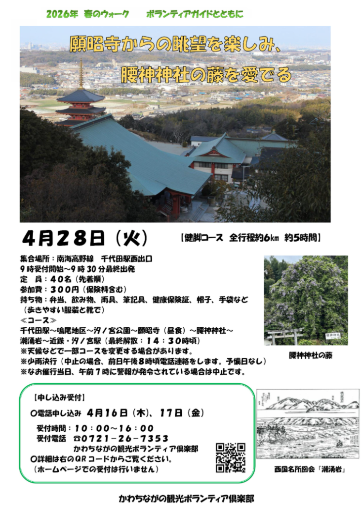 2026年春のウォーク ボランティアガイドと共にが4月28日に行われるのを前に4月16日、17日の2日間、申し込みがスタートします。申し込みは電話のみで、電話番号は0721-26-7353。10:00~16:00までの間に行ってほしいとのこと。