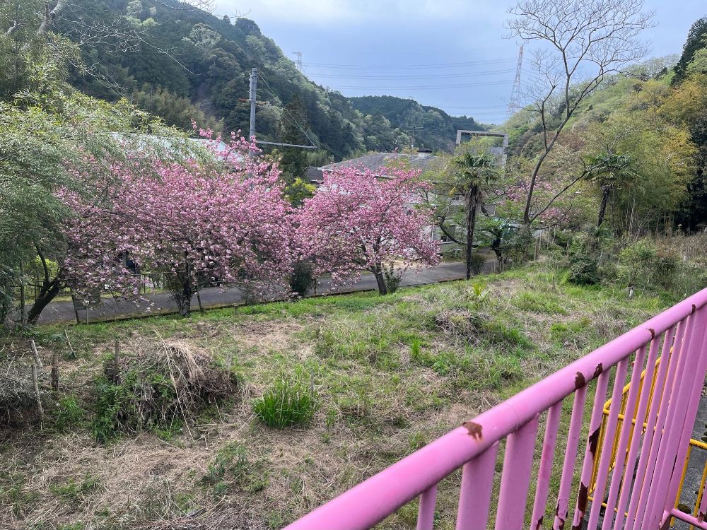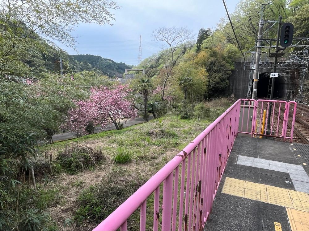 駅舎から降りて前方を見ると、遠くにピンクの花が咲いています。