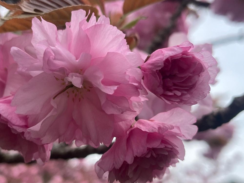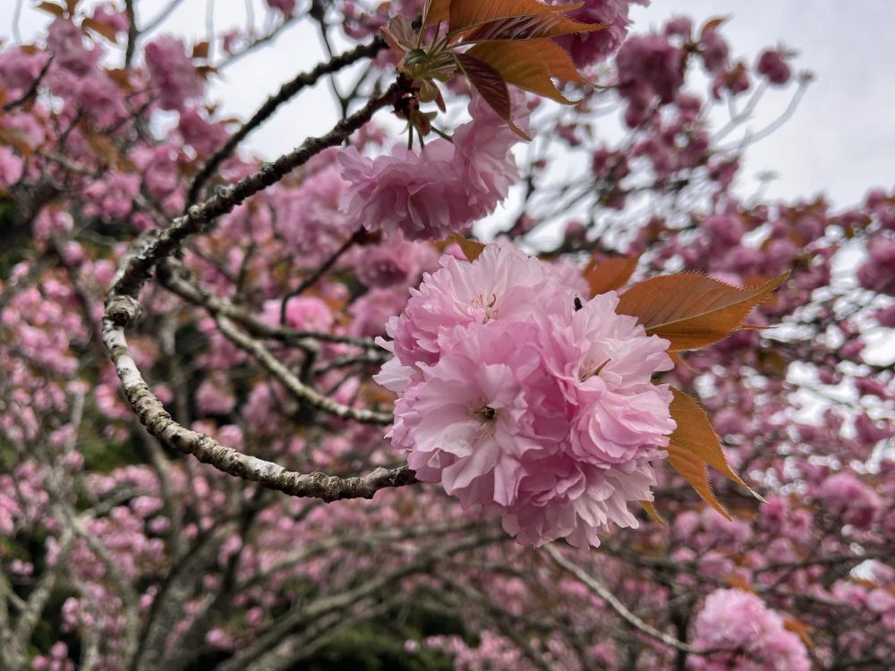 この日は曇りでした。ソメイヨシノだとピンクの色が薄くその良さがわかりにくいですが、八重桜は濃いピンクなので曇りでも問題なく映えます。