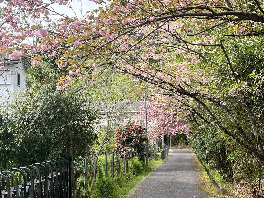 今年は開花が遅かったソメイヨシノもそろそろ終わり、葉桜が目立つようになりましたね。しかし、南海天見駅から歩いてすぐ、遊歩道の八重桜はソメイヨシノよりも遅咲きの桜。それがいよいよ満開という情報を得たので、昨日行ってきました。