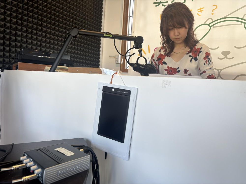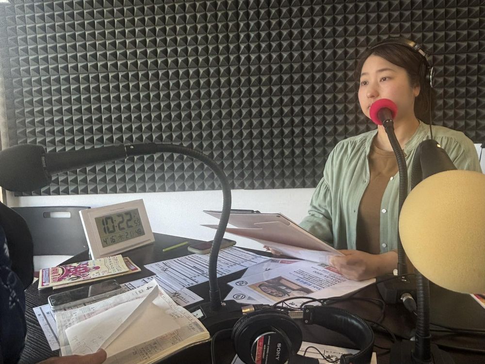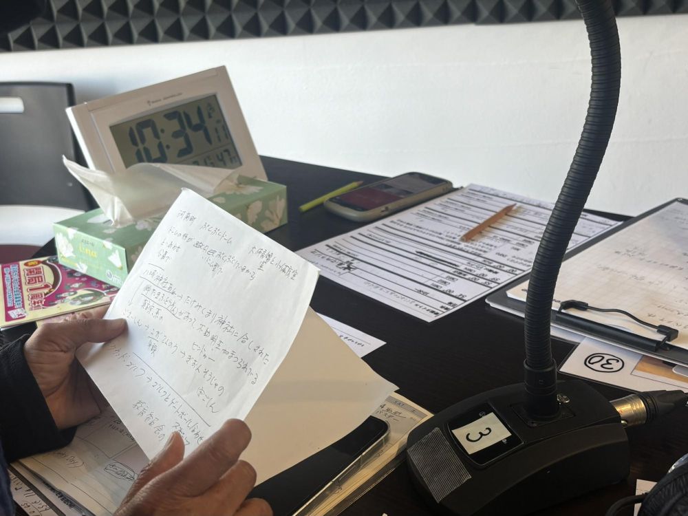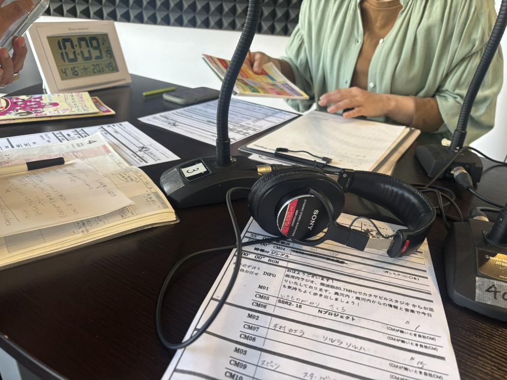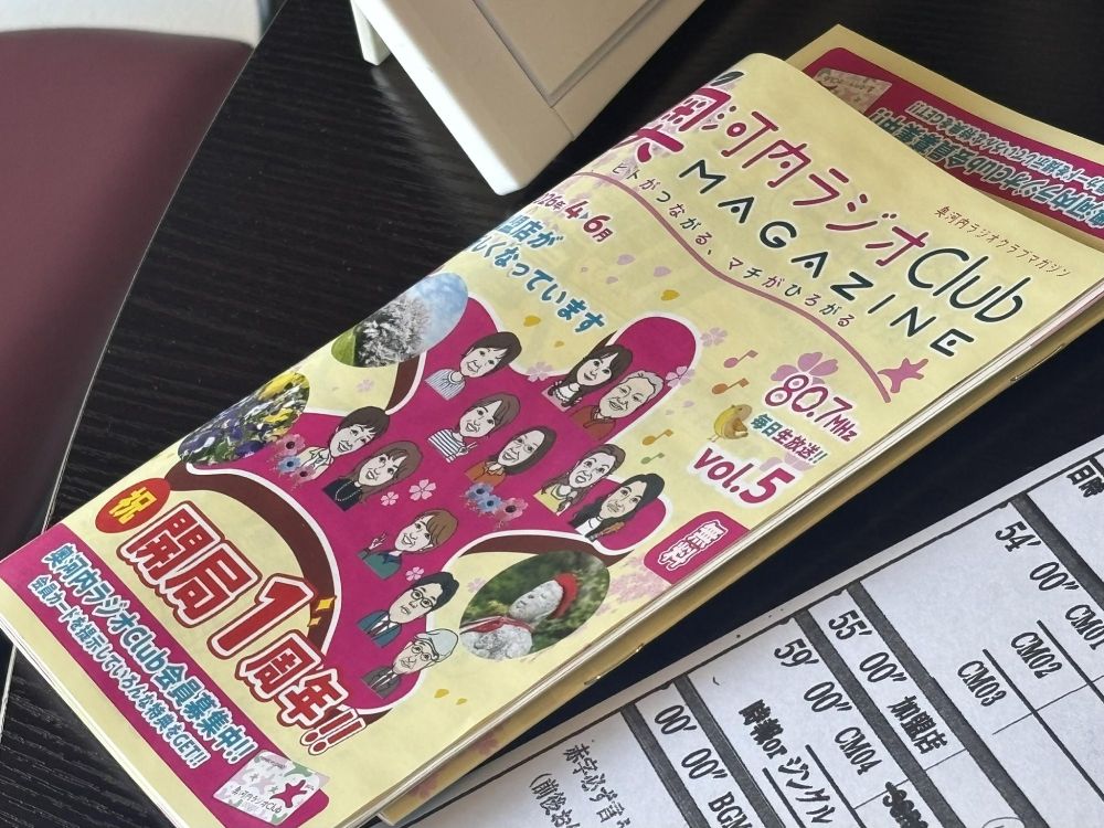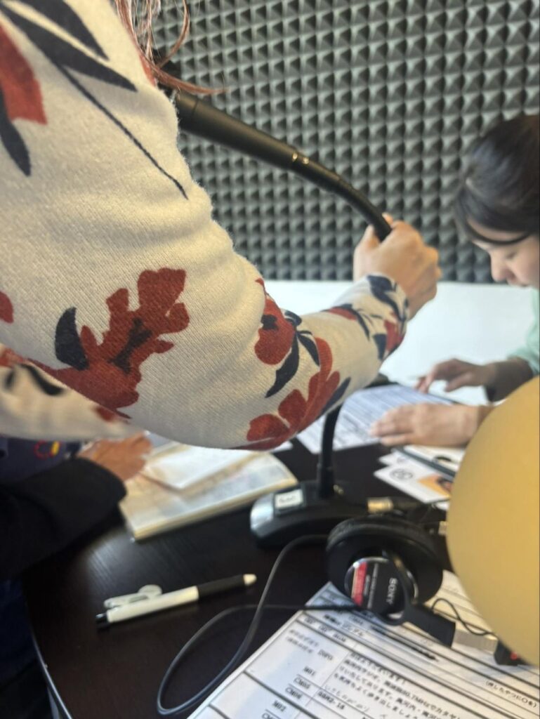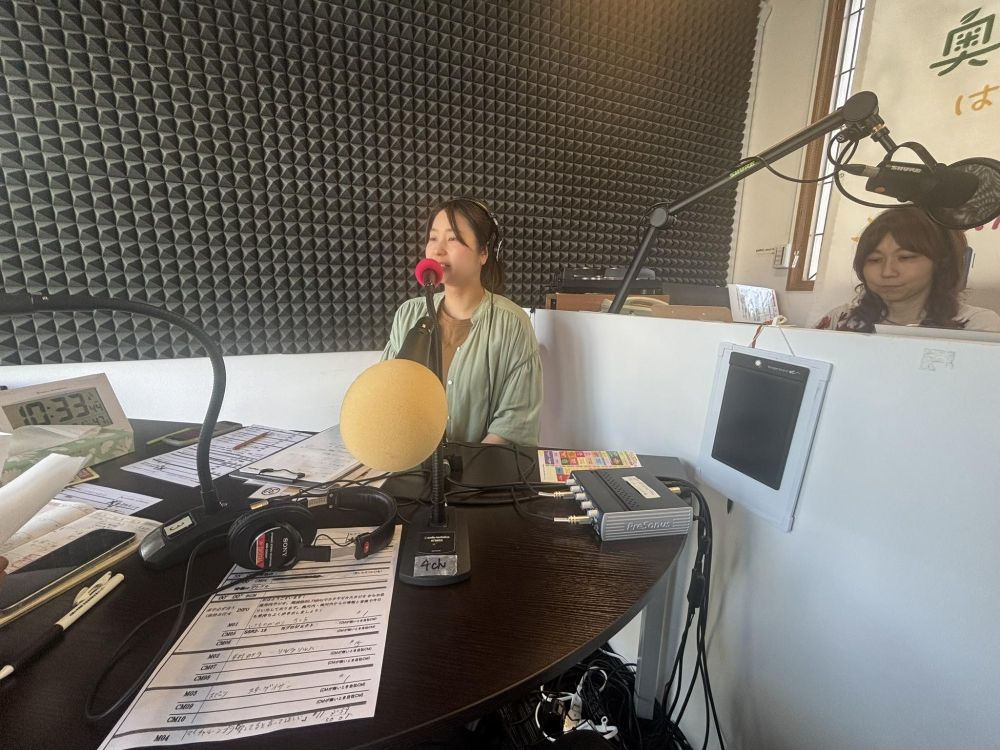 話がある程度進むと途中で音楽がかかり、そこでいったん休憩です。ラジオの場合は声を誰も出さないと放送事故になりますから、音楽を流す間、少しリラックスして次の打ち合わせを行っているわけです。