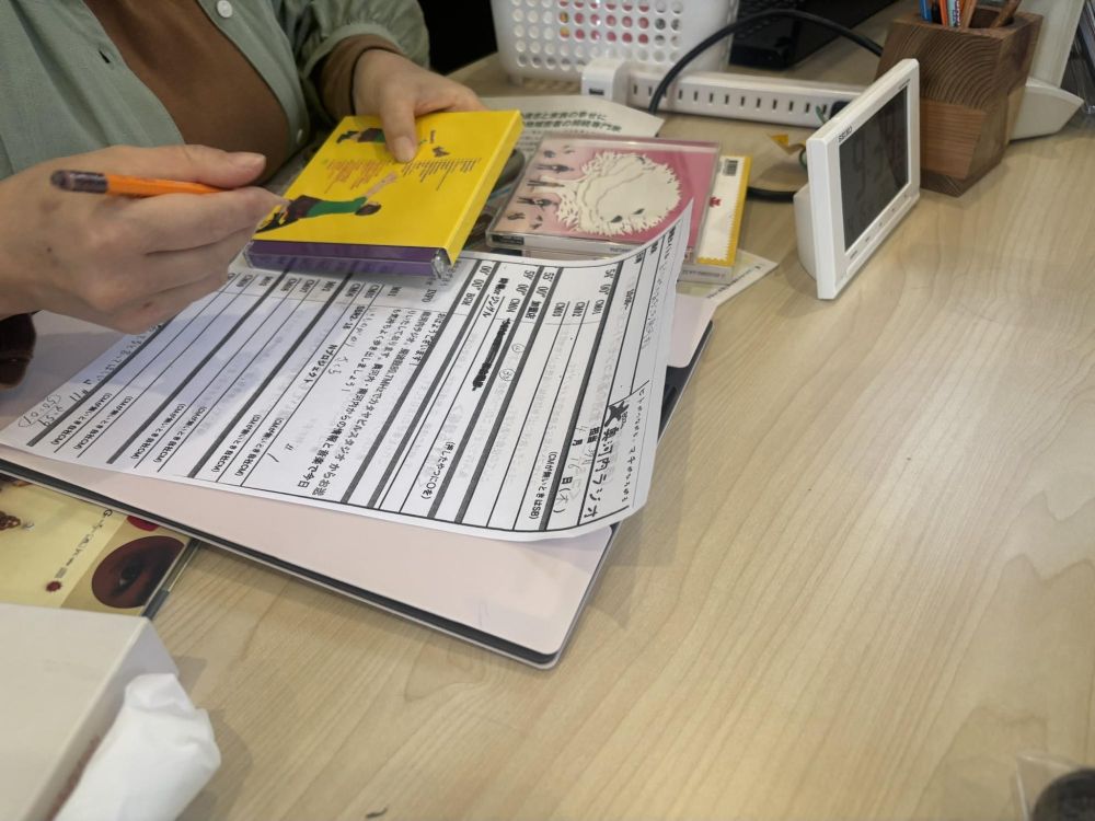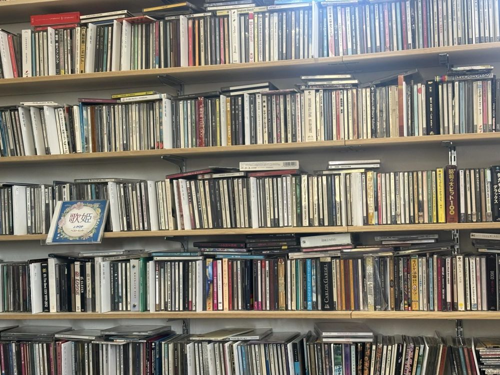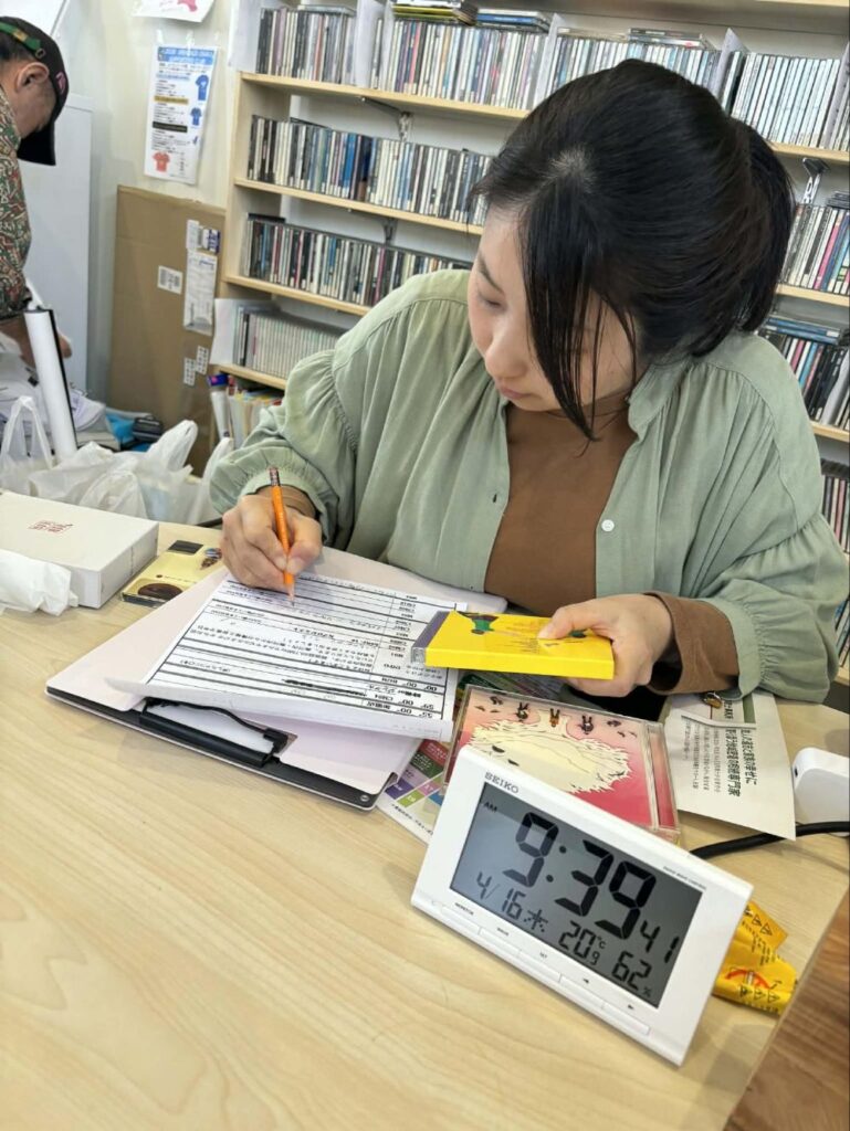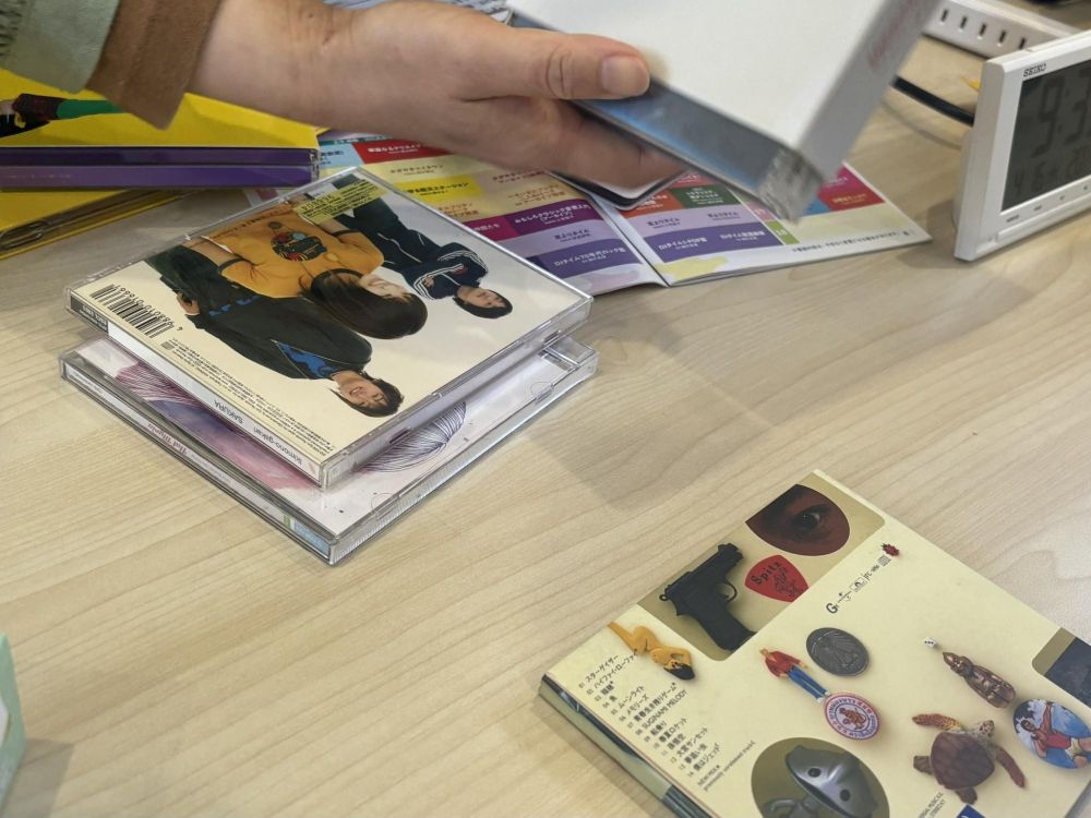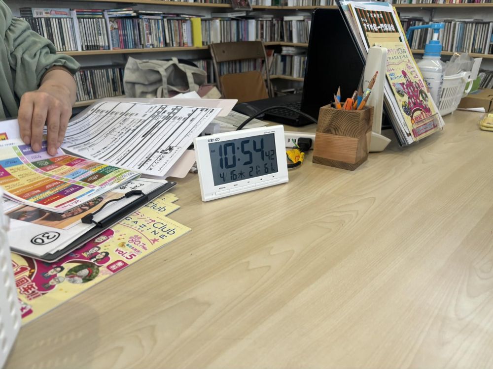 少し早い時間に現場に入りました。スタジオは1階にありますが、事務所が2階にあり、ここで打ち合わせができます。ラジオ局だけに壁にぎっしりとCDがあります。