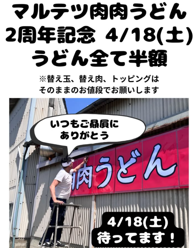 大阪狭山市のマルテツ食品では、2周年を記念して4月18日にマルテツ肉肉うどんがすべて半額です。(替え玉、替え肉、トッピングを除く)普段度も驚きのビックリの肉の量ですが、それが半額というのはすごいことです。