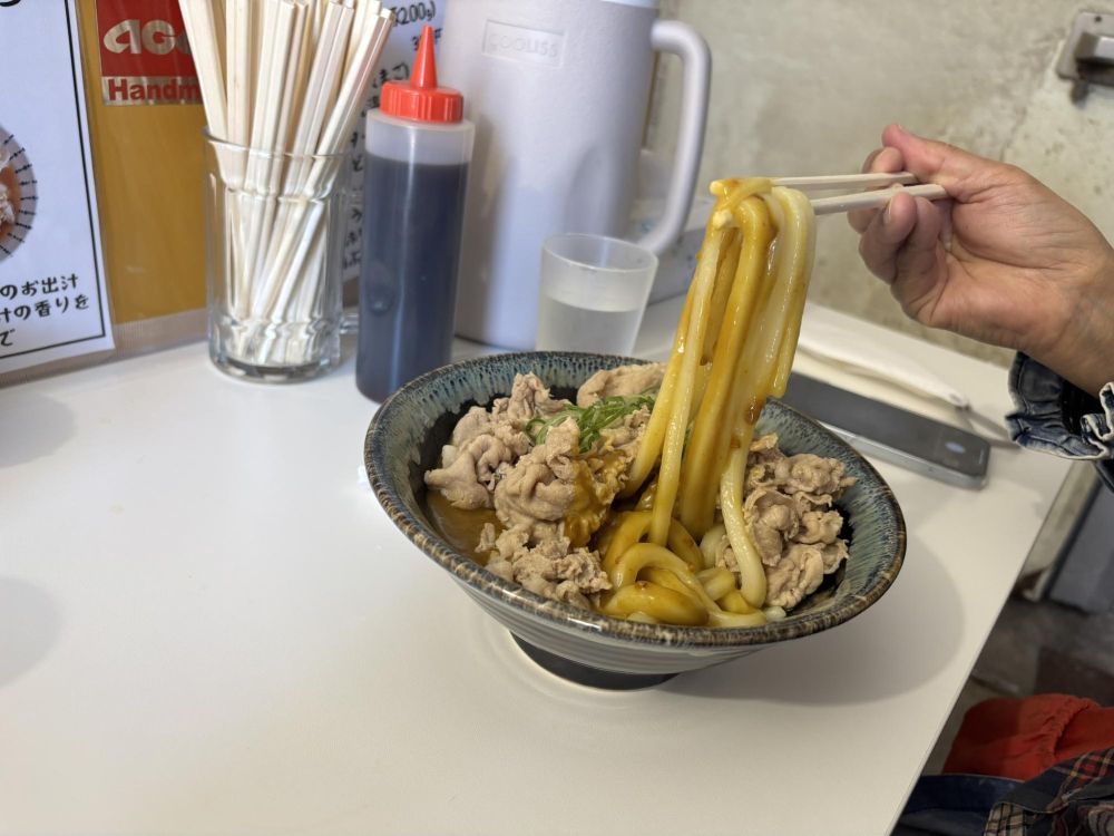 太うどんです。肉がふんだんに入った汁との相性はばっちりです。とはいえ、実はこちらのうどんは食べる前から美味しいことを知っていました。