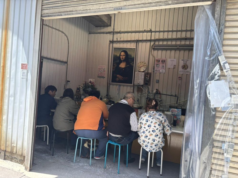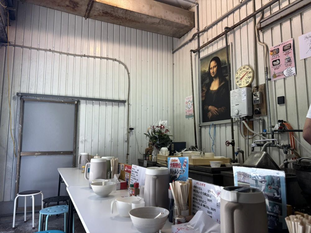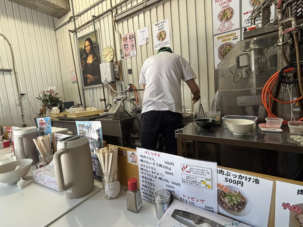 中に入ると、「いらっしゃい」と店主の方が声をかけてくれました。プレハブ風の工場の中にありますが、決して社員食堂などではなく、一般客向けのうどん屋さんです。それにしても工場の殺風景に見える空間に、モナリザの肖像が飾っているのが面白いですね。