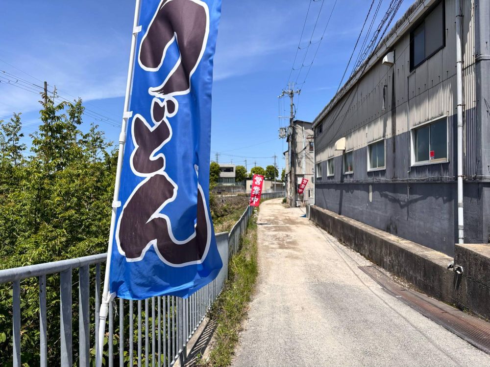 バス停から少し歩くと信号があり、その先に小さな川が流れていますが、よく見るとそこに幟(のぼり)がかすかに見えます。