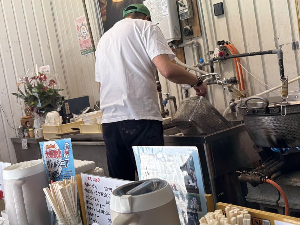 注文するとモナリザが不敵な笑みを浮かべている横で、店主さんがうどんをゆでてくださっています。