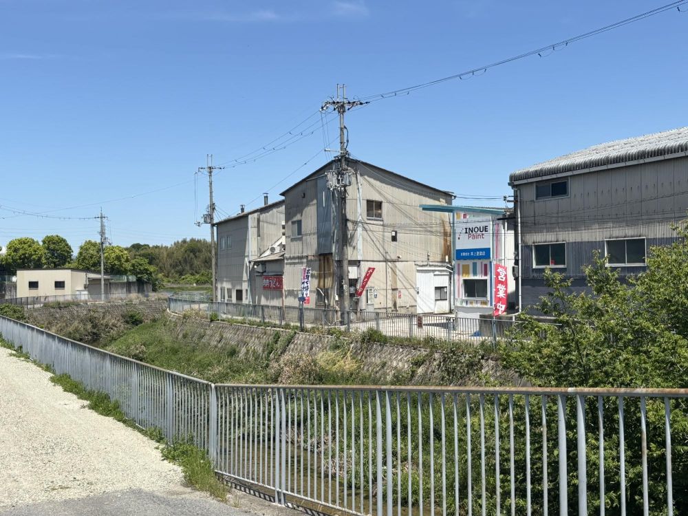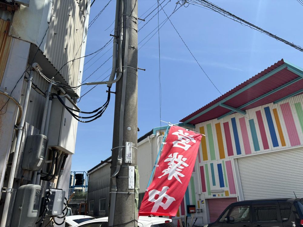 川の手前から見ると「営業中」の幟が見えます。でも周りに見えるのは町工場群。本当にお店があるのか、「営業中」という幟はもしかしたら幟を印刷する会社の見本ではと、ついつい疑ってしまいます。