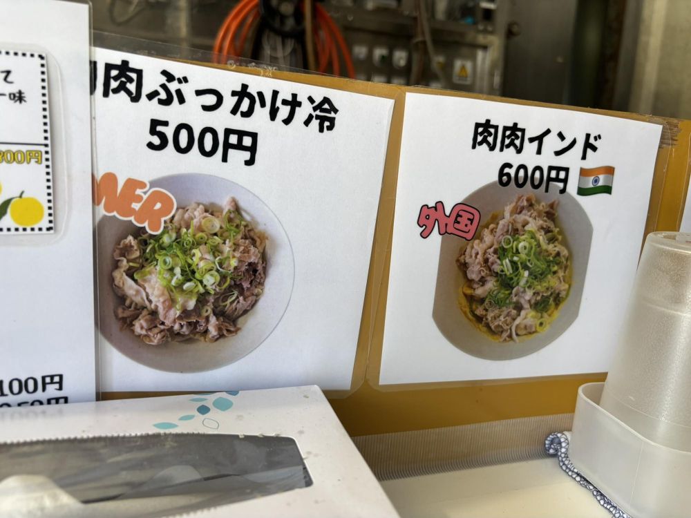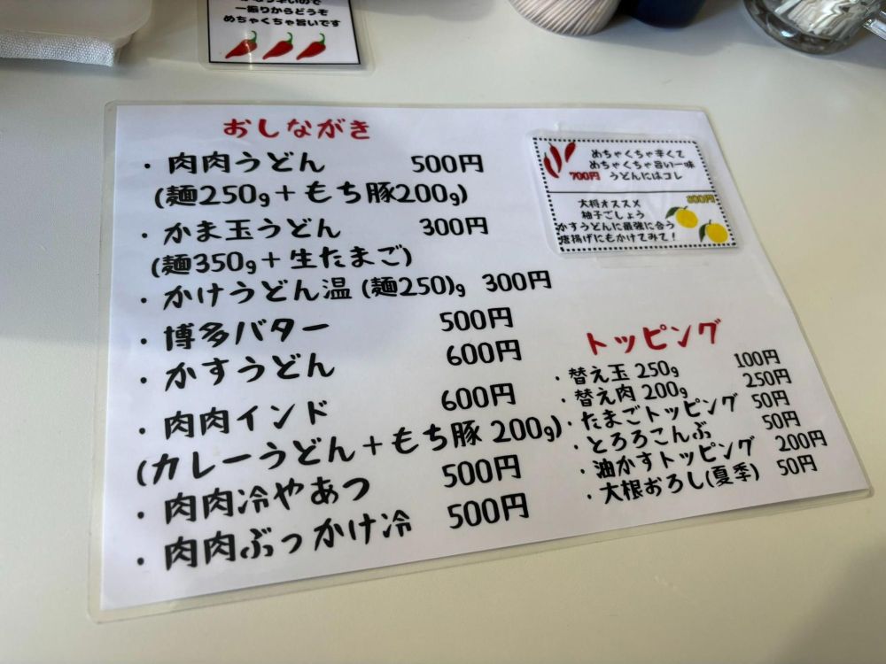 さて、おしながき「メニュー」を見ましょう。肉肉うどん(500円)以外にもいろいろあります。かま玉うどんやかけうどんは(300円)でとてもリーズナブル。そのほか博多バター(500円)、かすうどん500円、そして肉肉インド(600円)など結構種類が多いし、しかもどれも驚くほど安い!