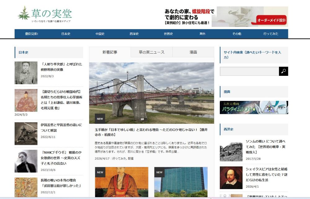 草の実堂(外部リンク)さんは歴史や雑学をテーマに情報を発信しているサイトで、主にこんなジャンルの記事を掲載しています。