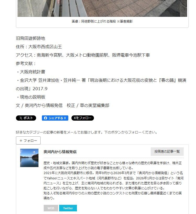 今回は最初のお試しということで「飛田遊郭跡地」を取り上げましたが、これからは楠木正成や天誅組、あるいは河内キリシタンのことやもっとマニアックな地域の伝承など、南河内地域に住んでいて、かつて「大きな看板」を背負って歩き回った4年半の実績があればこそ書ける記事をわかりやすく書ければと考えています。