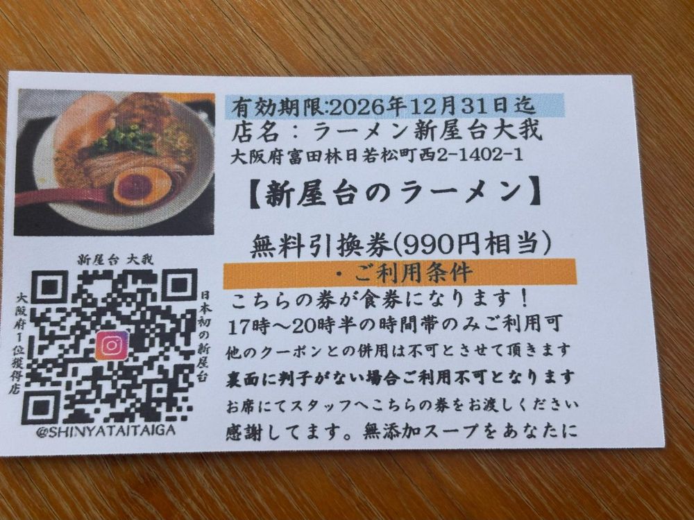 今回ラーメンを注文すると、こちらの無料引換券を頂きました。1回の注文で二度楽しめるのはいいですね。17時から20時半までという時間帯の限定はあるもののの、確かにお得です。