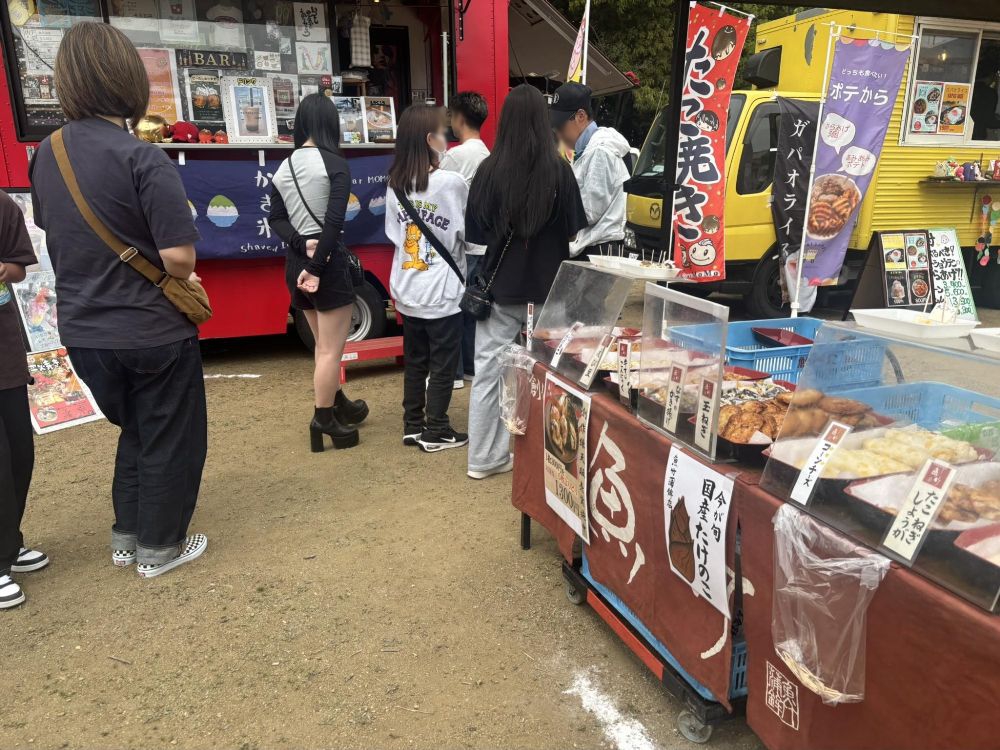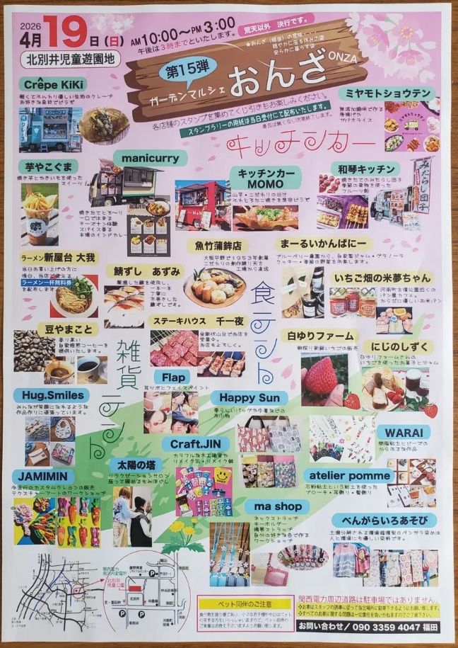 北別井児童遊園地のある場所は別井というところ。地図を見るとよくわかりますが、富田林最東端にあり、3方向が河南町に囲まれています。そのため文化圏的には河南町に近いかもしれません。児童遊園地としても富田林で最も東にあります。そのためでしょうか?出店者を見ると富田林と河南町の名店が集まっていました。