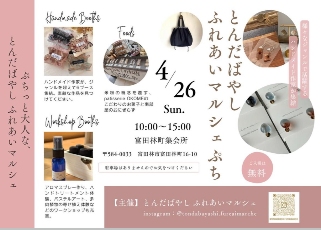 4月26日10:00~15:00まで、富田林町集会所でとんだばやしふれあいマルシェぷちが開催されます。コンセプトは「ぷちっと大人な、とんだばやしふれあいマルシェ」とのこと。