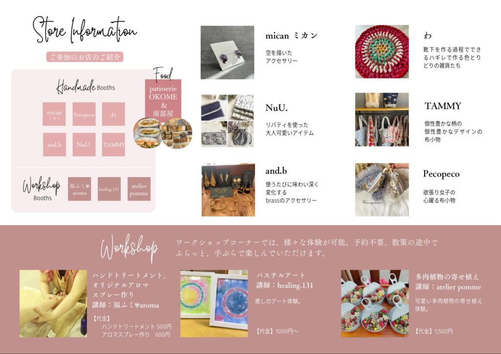 ハンドメイド、ワークショップ、フードのブースが登場します