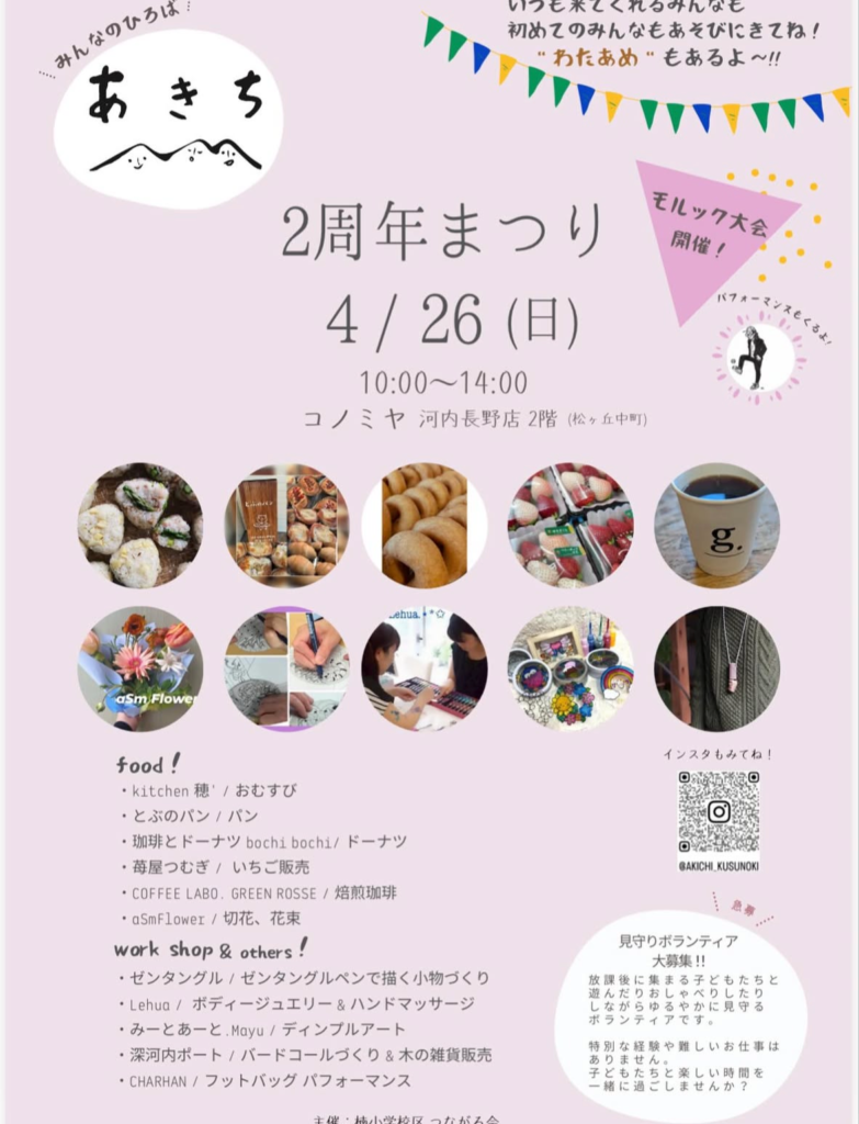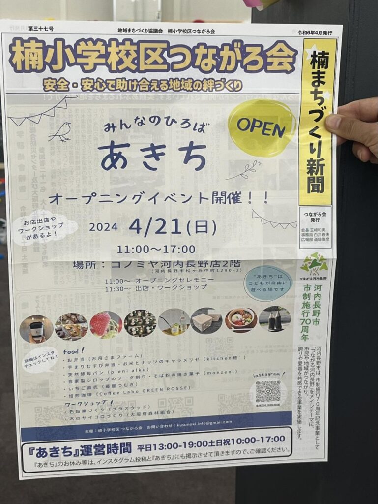 私が知っている限りでは「あきち」が付く場所が河内長野には2カ所あります。ひとつは河内長野駅前長野商店街のAKICHIDE PARK(アキチデパーク)で、もうひとつが、楠町つながろ会の「あきち」です。