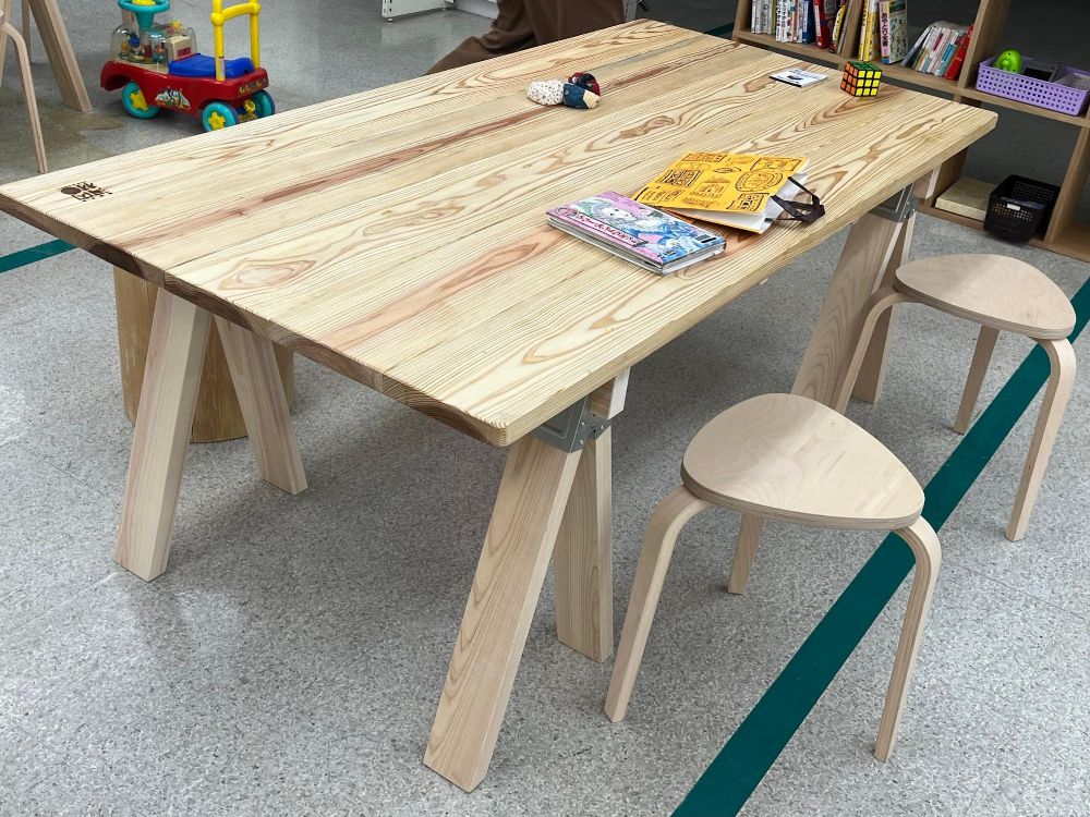 使っているテーブルと椅子は、地元河内長野のおおさか河内材を使用しました。テーブルでは飲食も可能とのこと。