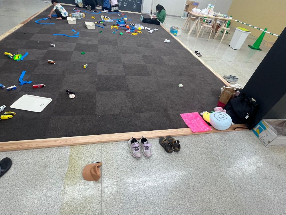 「あきち」では、現在子どもがワクワクする居場所を一緒に作ってくれるメンバーを募集中です。さて、改めて空き地を見ましょう。画像のじゅうたんのエリアだけは土足厳禁で飲食不可です。