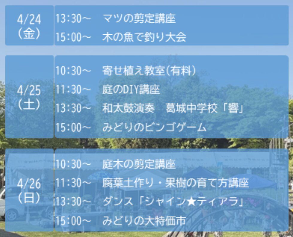 - 土曜日は有料の寄せ植え教室、庭のDIY講座、和太鼓演奏葛城中学校「響」、みどりのビンゴゲームが行われます。