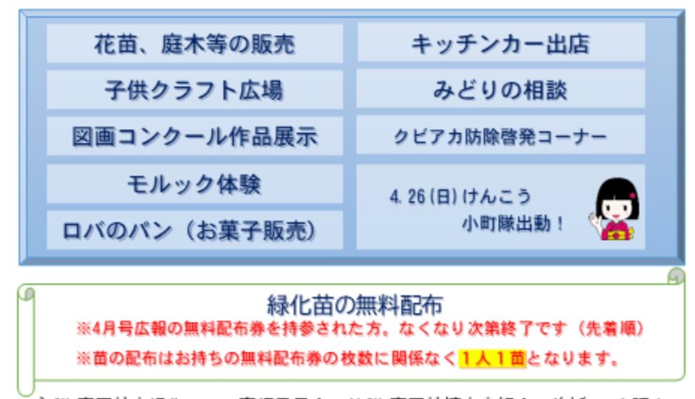その他の催しはこちらです。冒頭に紹介したキッチンカーや花苗・庭木の販売の他にも、みどりの相談や子供クラフトひろば、図画コンクール作品展示、モルック体験、ロバのパン、今みんなが最も頭を悩ましているクビアカ防除啓発コーナーもあります。