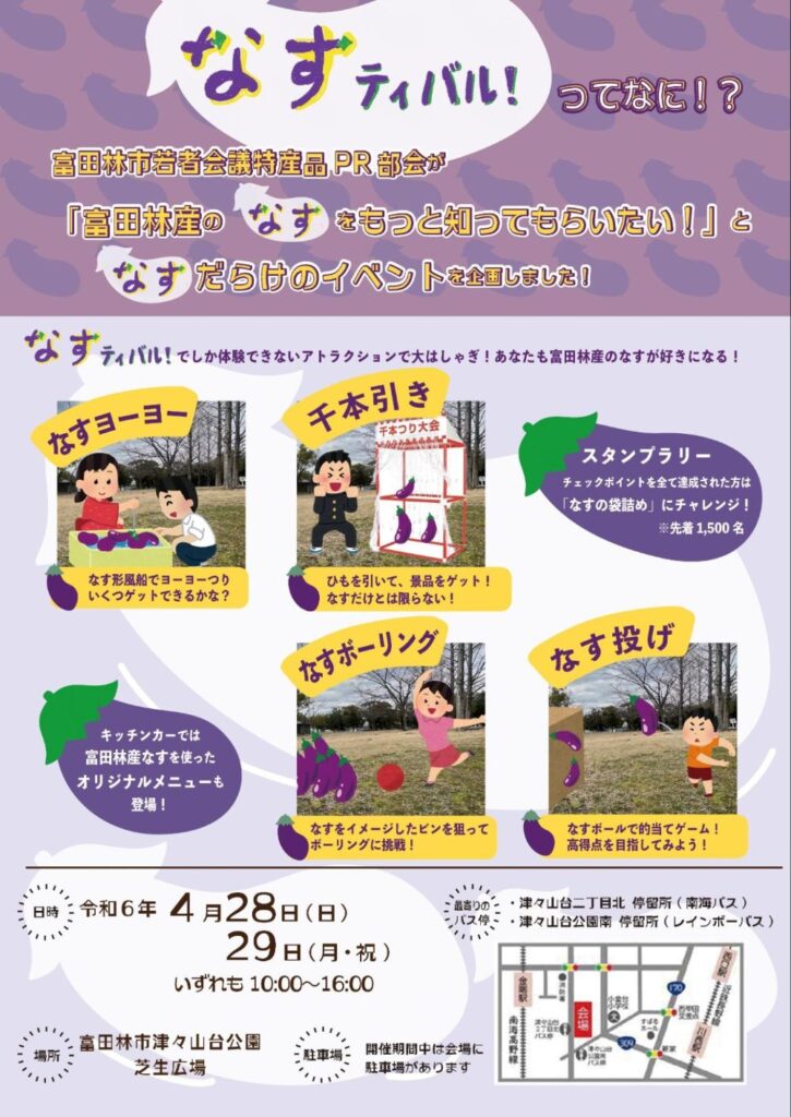 これは富田林市若者会議特産品PR部会が、「富田林産のなす」をもっと知って欲しいとの思いから企画したイベントです。