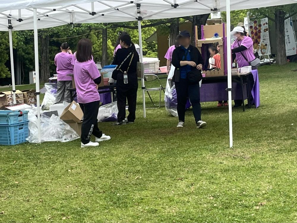 2年前は緑化フェア&植木市のすぐ横で行われていました。大きな特徴としてなすの色を重視した点です。スタッフの着用しているシャツをはじめ、テーブルや床のシートなどもナスの色に統一していました。