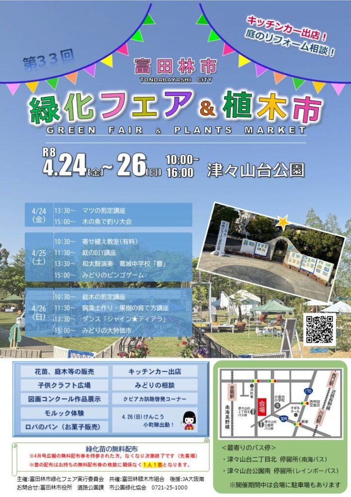 そんな中、富田林のGW前半の恒例イベントといえば、やはり富田林市緑化フェアー&植木市ではないでしょうか?33回目を迎えた恒例イベント。2026年は4月24日から26日までの3日間行われます。