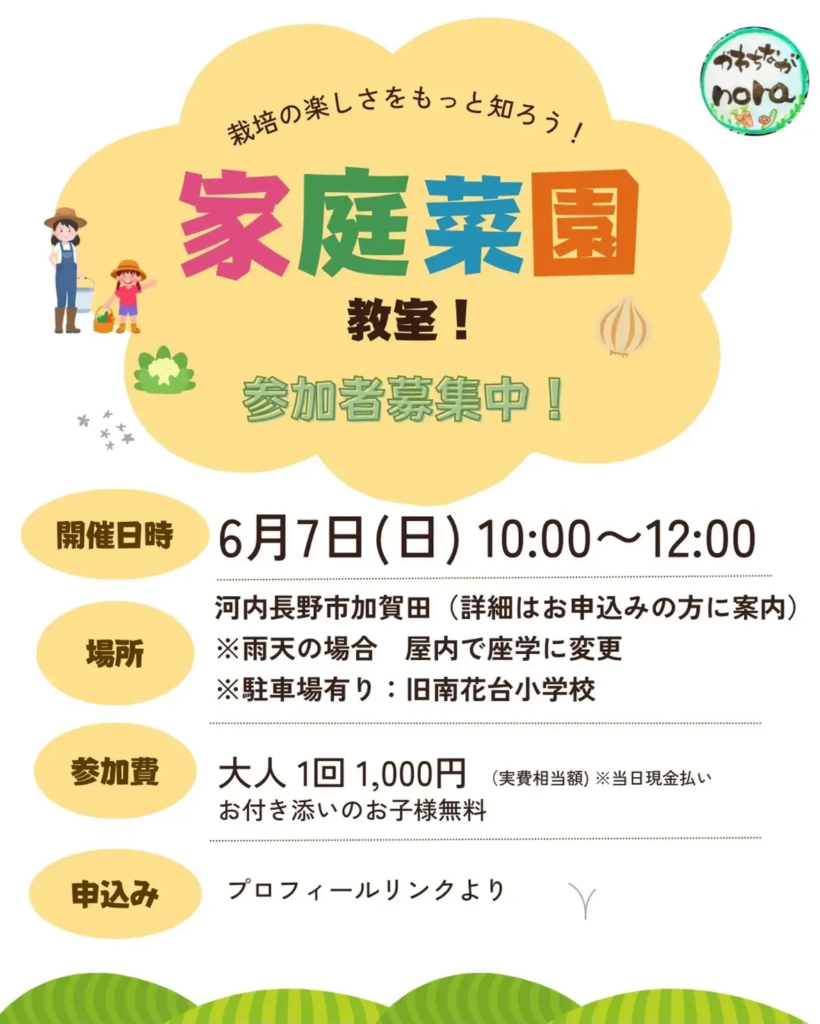 かわちながnoraでは、6月7日に河内長野市加賀田の畑で家庭菜園教室を開催。参加者を募集しています。料金は大人1回1000円で当日現金払いのみ、付き添いのお子さんは無料です。